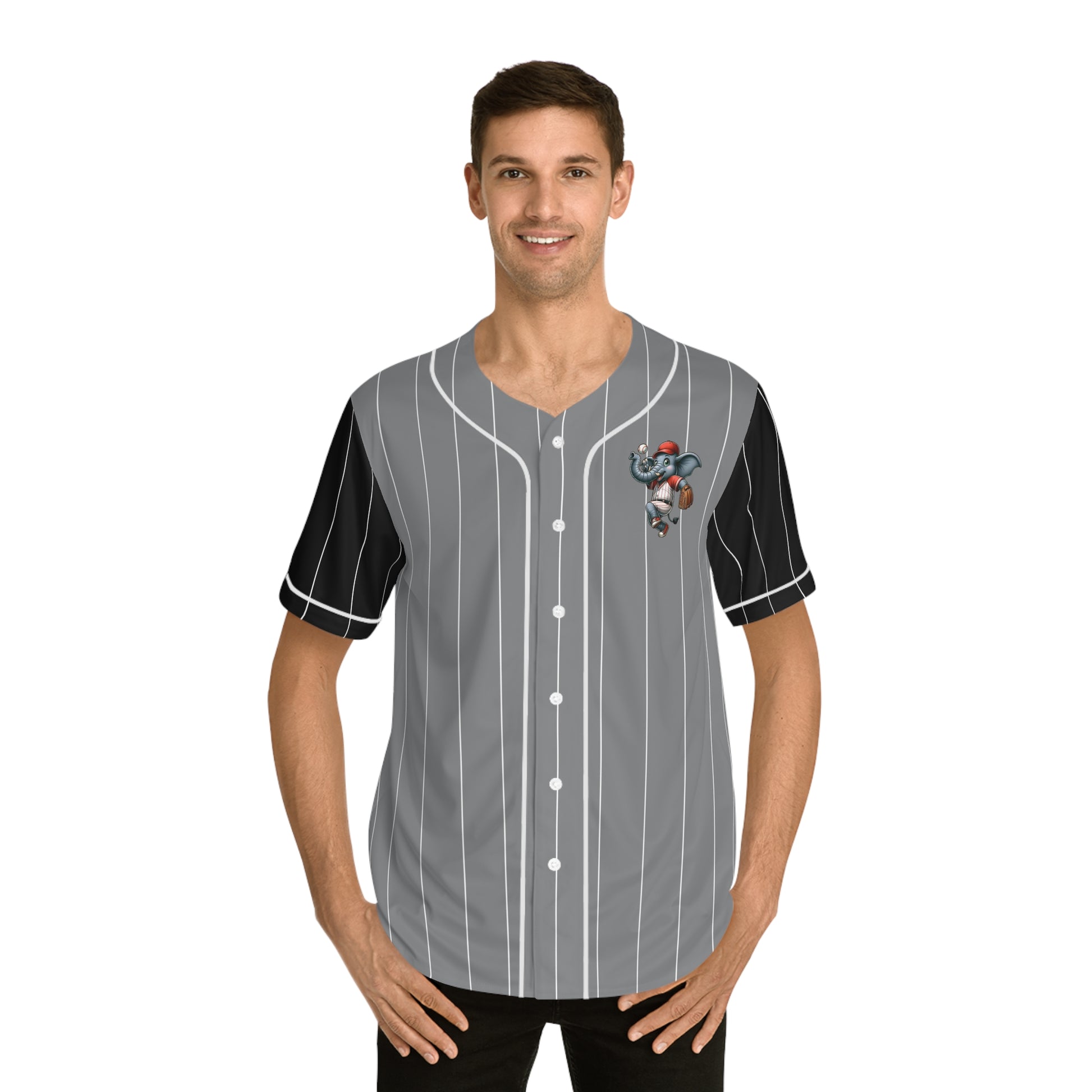 Gray Men's Baseball Jersey with White Pinstripes and Black Sleeve with Playful Elephant Logo
