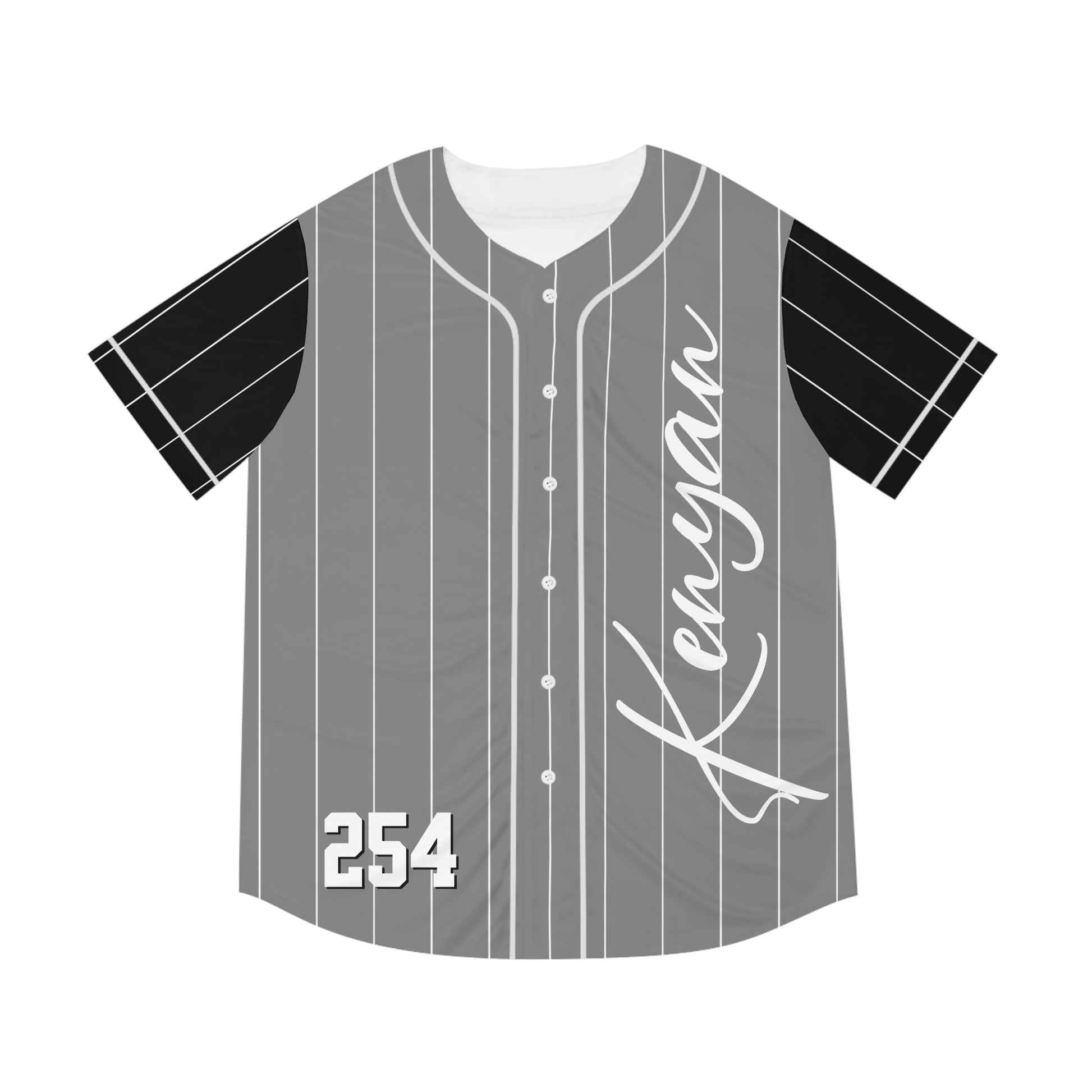 Gray Men's Baseball Jersey with White Pinstripes and Black Sleeves with "Kenyan" and "254"
