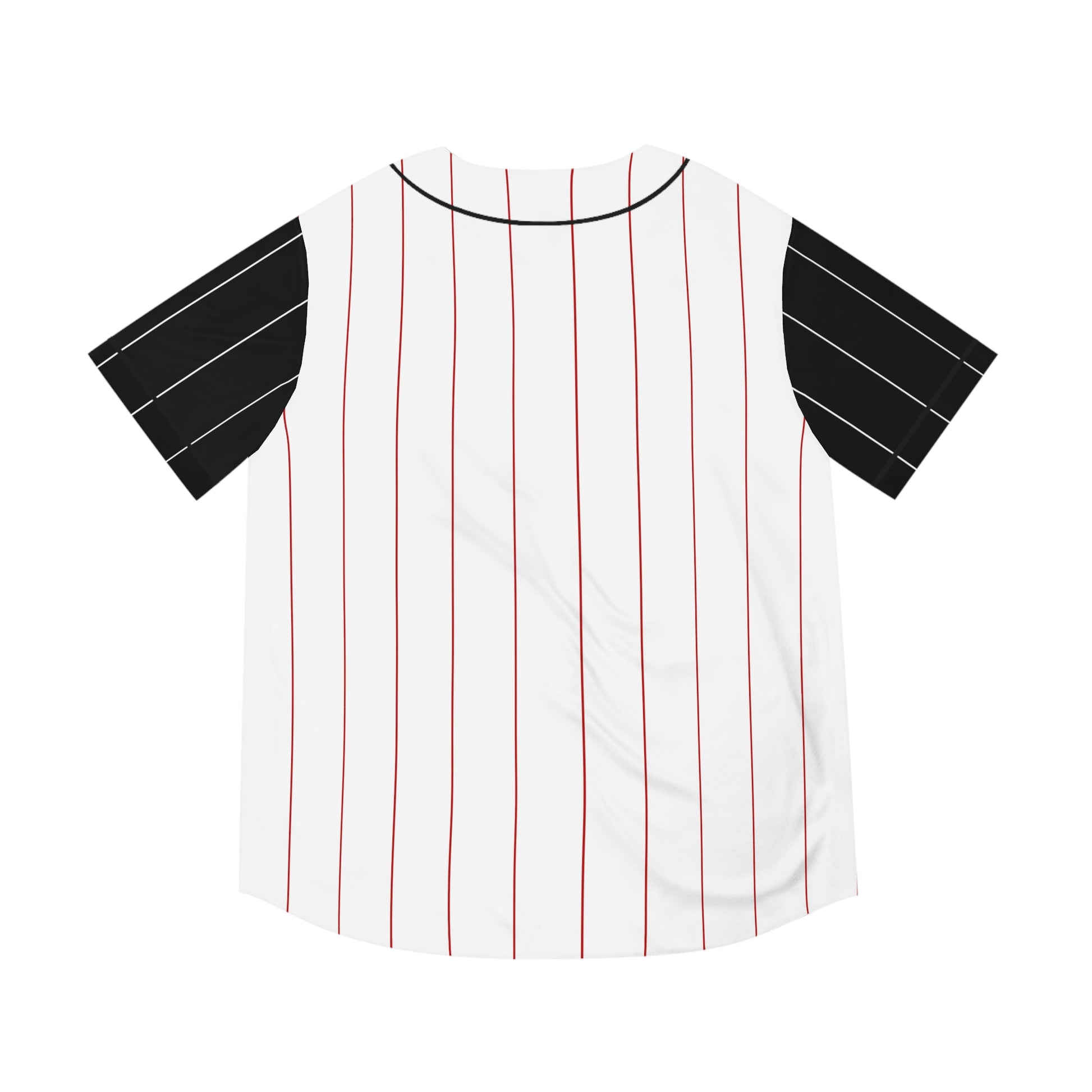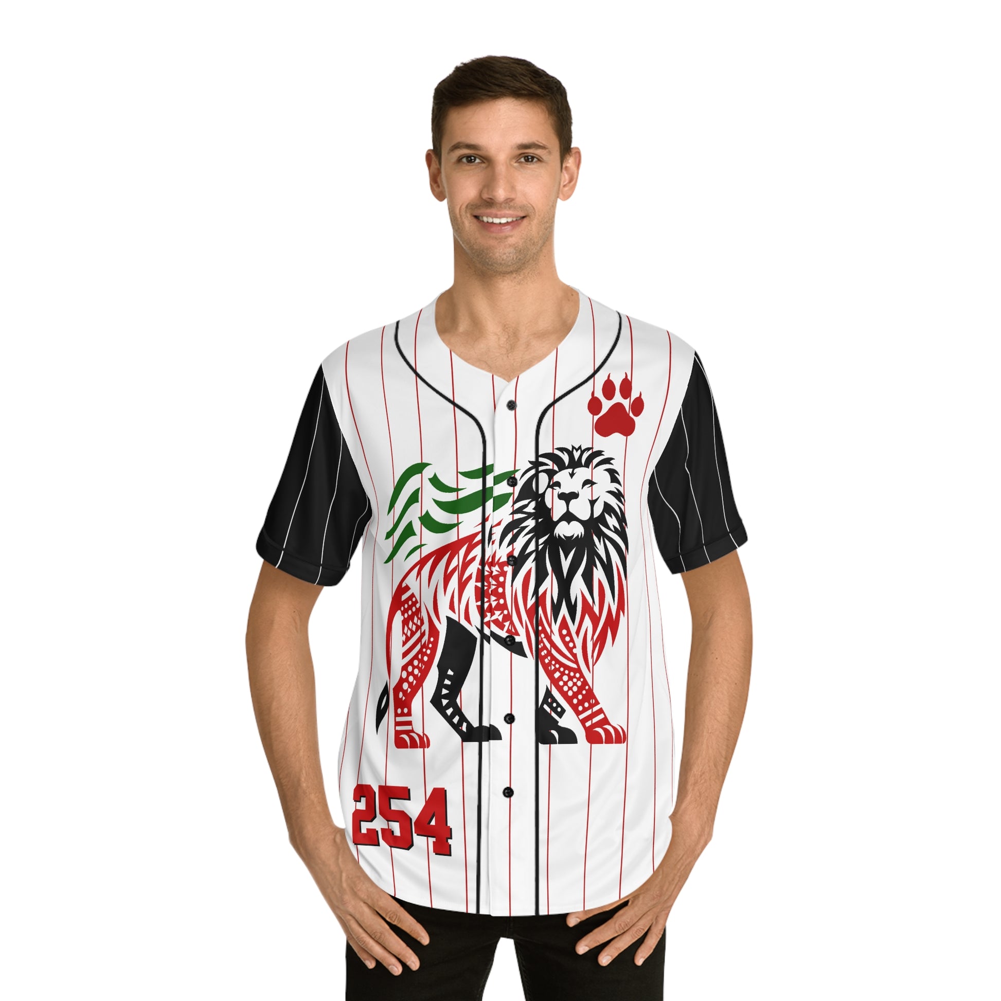 White Men's Baseball Jersey with Red Pinstripe and Blak Sleeves with Red Paw Print and "254" with the Nairobi Lion